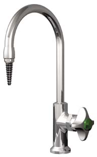 Distilled Water Gooseneck Faucet, Tin-Lined^ Deck mounted chrome-plated brass faucet with a tin-lined interior and white nylon self-closing 4-arm handle. 15.2cm spread gooseneck with removable serrated hose end. Complete with 1.27cm IPS shank, locknut and washer.