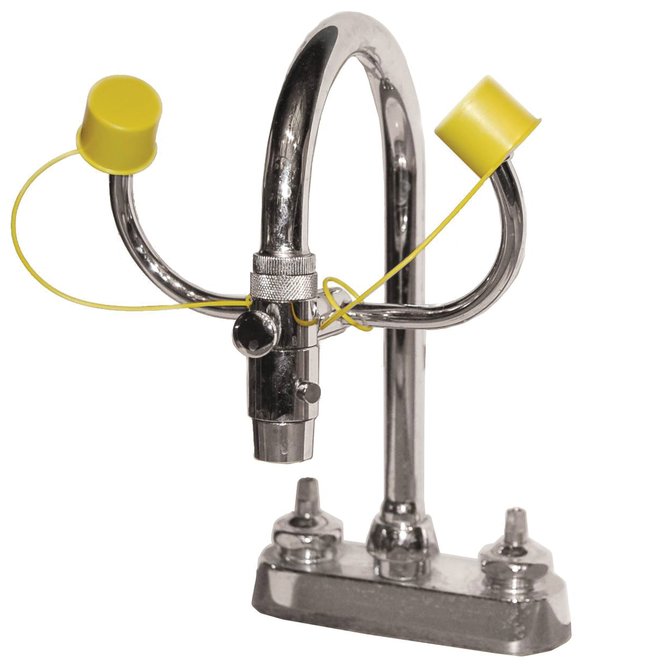 Unit is activated by an actuator pin on adapter. When pin is in closed position, faucet can be used for normal operation.Mounts to both standard and gooseneck faucets Features chrome-plated brass pipe, fittings, faucet adapter, and twin sprayhead assemblyYellow dust covers pop off when eyewash is activatedTo eliminate risk of scalding the eyes, disconnect hot water supply to the faucet or install tempered water system.Order InfoAdapter on unit is 0.86 in. x 27 thread (female), but includes two additional adapters to fit most faucets (0.81 in. x 27 thread [male] and 0.94 in. x 27 thread [male])CertificationsSEI certified to comply with ANSI™ Z358.1-2004.