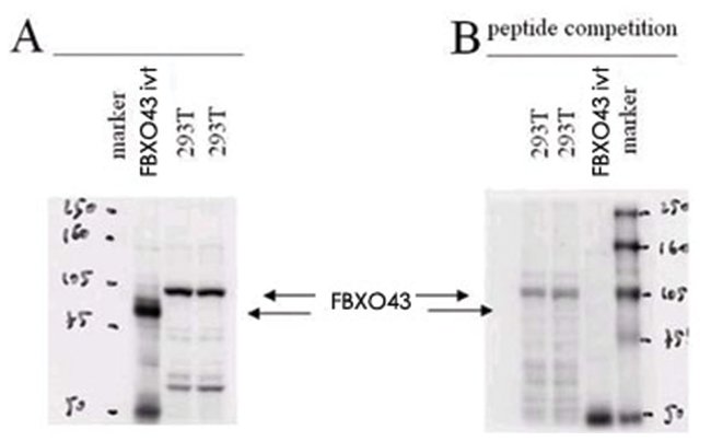 FBXO43 Rabbit anti-Chimpanzee, Human, Polyclonal Antibody, Abnova, Rabbit polyclonal antibody raised against synthetic peptide of FBXO43, Each