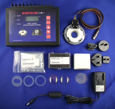 FCS2 starter set^ FCS2 starter set, A parallel plate, high compatible, uniformly temperature controlled microscopic flow cel, Includes: FCS2 Chamber, Controller, 5 Micro aqueduct Slides, 100 1.5 - 40mm German Desag263 Coverslips, and 30 piece Gasket Set