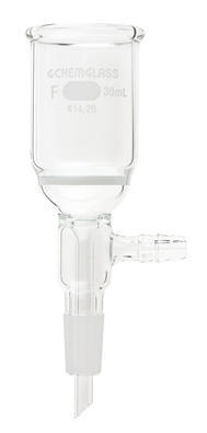 FILTER FUNNEL, BUCHNER, INNER JOINT^ 15ml. Joint size: 19/22. Porosity: F. Buchner style filter funnel having a lower standard taper inner joint and serrated tubulation for connection to a vacuum source. Disc diameters and height above the disc are the same as CG-1402.