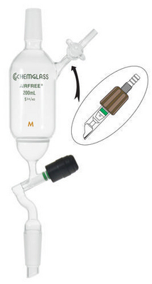 FILTER FUNNEL, AIRFREE^ 200ml. Joint size: 24/40. Frit O.D; 40; Porosity: Medium; Sidearm Stopcock Type: Valve. Similar to AF-0542 but with the top having a standard taper inner joint instead of the outer joint.