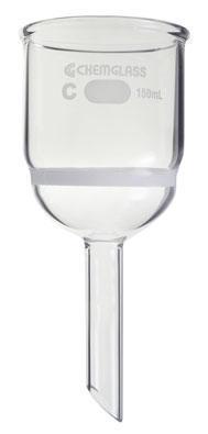 FILTER FUNNEL, BUCHNER^ 60ml. Disc O.D; 40mm; Stem O.D.xLength: 10X75; Height Above Disc: 50mm. Porosity: F. Funnel has a sealed in glass fritted disc of the listed porosity. Useful wherever filter paper or membranes cannot withstand the chemical attack of the filtrate.