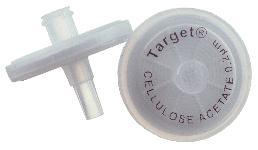 Target* Syringe Filter, Cellulose Acetate Membrane^ Pore size: 0.2um. Diameter: 30mm. Cellulose acetate membrane for biological or protein-based samples. Low non-specific binding with limited chemical resistance. For volumes up to 100mL. Can be used for cold sterilization.