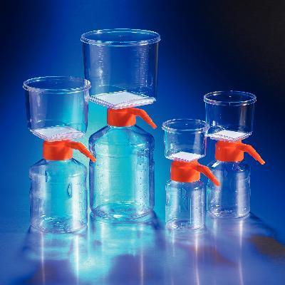 Corning* Vacuum Filter/Storage Systems, Sterile^ 250mL capacity, two-piece system for vacuum filtration of aqueous solutions. Angled hose adapter. Receiver converts to a storage bottle. Glass prefilter. Cellulose Acetate membrane. 0.45um pore size. 50mm filter diameter.