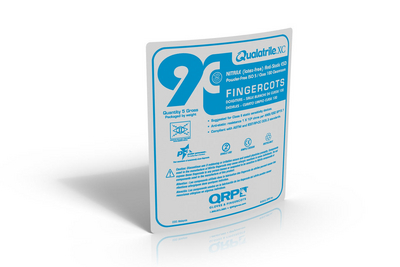 Qualatrile* ISO Class 5 Nitrile Antistatic Finger Cots^ Made from 100% nitrile, latex-free. Ideal for use in the handling and assembly of Class II ESD-sensitive devices (with thresholds above 1000V). Powder-free. Resistant to common glues and epoxies. Thickness: 3mil. Color: white. Size: medium.