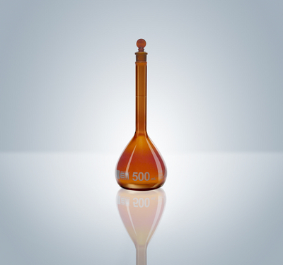 Hirschmann* volumetric glass flask^ 1000 mL, amber glass for light-sensitive materials, class A, TC, according to ASTM E288 specifications, tolerance /- 0.30 mL, with TS glass-stopper no. 22, with fine white graduation line and marking spot, pack of 1