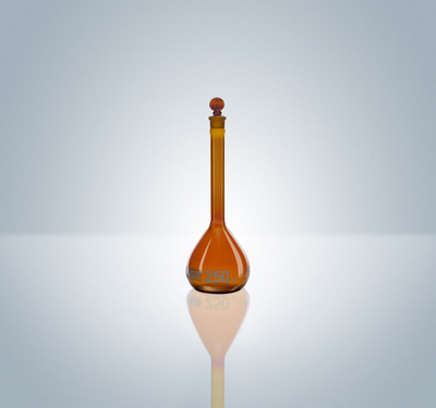 Hirschmann* volumetric glass flask^ 200 mL, amber glass for light-sensitive materials, class A, TC, according to ASTM E288 specifications, tolerance /- 0.10 mL, with TS glass-stopper no. 16, with fine white graduation line and marking spot, pack of 2