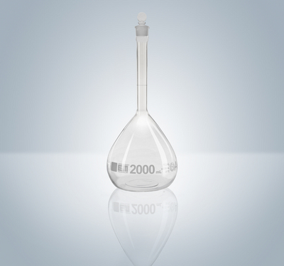 Hirschmann* volumetric glass flask^ 2000 mL, class A, TC, serialized and certified, according to ASTM E288 specifications, tolerance /- 0.50 mL, with TS glass-stopper no. 27, with fine white graduation line and marking spot, with Certificate of Identification and Accuracy, pack of 1