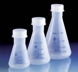 Erlenmeyer Flask^ Wide-mouth for easy pouring. Made of translucent, autoclavable, polypropylene. Supplied with a polypropylene screw cap. Compatible with 34/35 [standard joint] stoppers (not included). Volume: 50mL. Graduation increments: 10mL. Thread size: GL40.