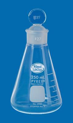 Erlenmeyer Flask, with Standard Taper Outer Flask Joint^ Capacity: 500mL. Flask Joint Size: 32. Supplied complete with glass pennyhead stopper