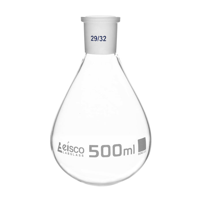 Evaporating Flask made of high quality, heavy duty, 3.3 borosilicate glass. 500ml capacity. Single interchangeable joint with socket size 29/32. Stands 6.75" tall, and is 4" in diameter at its widest point. Perfect for any home, school, or professional science laboratory.