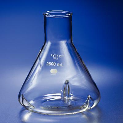PYREX* Brand Fernbach Culture Flask^ Wide-mouth flask is triple baffled on the bottom outside edges to achieve maximal oxygen transfer to culture medium. Beaded neck accepts a cotton plug or #13 rubber stopper. Volume: 2800mL. Neck ID: 63mm. Dimensions: 200O.D.x230Hmm.