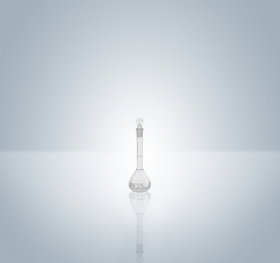 Hirschmann* volumetric glass flask^ 25 mL, class A, TC, according to ASTM E288 specifications, tolerance /- 0.03 mL, with TS glass-stopper no. 9, with fine white graduation line and marking spot, pack of 2