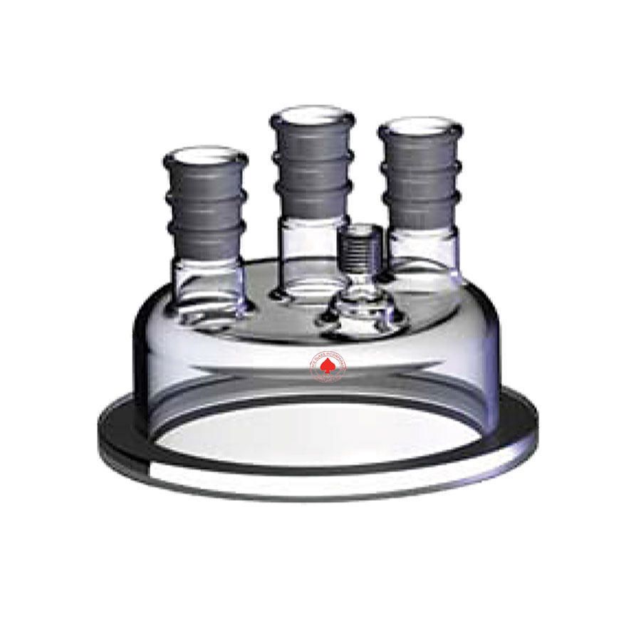 Head 45/50 center flat flange 2^ Head, 45/50 center, Type: flat flange, Two-24/40 sides, One Number 7 Ace-Thred*, Dimensions: 137 mm OD x 100 mm ID, with four neck, three inline standard taper joints and one perpendicular Number-7 Ace-Thred* thermometer joint, Included nylon bushing and FETFE o-ring