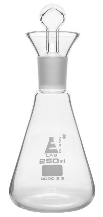 250ml capacity, iodine flask with ground joint and interchangeable stopper made of high quality, heavy duty 3.3 borosilicate glass. Used for iodine value determination. Ungraduated. Socket size 24/29. Flask measures 6.25" tall and has a base diameter of 3.25". Eisco Labs Borosilicate glass has the following heat tolerances: Strain Point -515°C | Annealing Point 565°C | Softening Point 820°C.