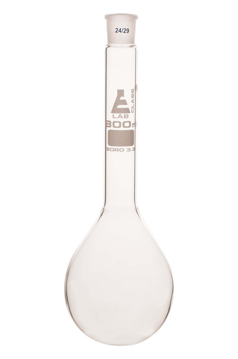 Borosilicate glass, long neck, round bottom, 24/29 socket size. Designed for nitrogen determination as per Kjeldahl method. Conforms to DIN ISO 12360 standard. Flask measures 13" tall and 5" width at its widest point.Autoclavable, with superior chemical durability. Low temperature gradient- can withstand high temperatures & thermal shocks. Eisco Labs Borosilicate glass has the following heat tolerances: Strain Point 515°C | Annealing Point 565°C | Softening Point 820°C.Eisco Labs proudly manufactures its own products using state-of-the-art equipment, and following the highest standards of quality control.