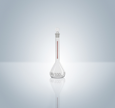 Hirschmann* volumetric glass flask^ 100 mL, class A, TC, according to ASTM E288 specifications, tolerance /- 0.08 mL, with Schellbach line on neck for high contrast and easy meniscus reading, with TS glass-stopper no. 13, with fine blue graduation line and marking spot, pack of 2