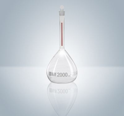 Hirschmann* volumetric glass flask^ 1000 mL, class A, TC, according to ASTM E288 specifications, tolerance /- 0.30 mL, with Schellbach line on neck for high contrast and easy meniscus reading, with TS glass-stopper no. 22, with fine blue graduation line and marking spot, pack of 1