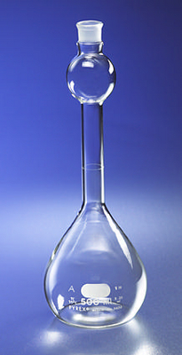 PYREX* brand Volumetric Flasks, MCA, [Standard Taper] Stopper, Class A^ 500ml. Tolerance: -0.2ml. [Standard Taper] Stopper: 19. The upper bulb between the stopper and the capacity graduation is approximately 1/10 the flask rated capacity. The bulb assists in the mixing of liquids or powders.