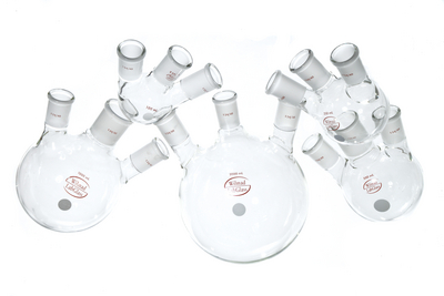 Boiling Flask, Round Bottom, 3-Neck^ Capacity: 100mL. Joint Sizes: Center Neck: [ST] 14/20; Side Necks: [ST] 14/20. Round bottom 3-neck boiling flask with vertical center neck and two side necks that are 180 degrees apart and inclined at a 20 degree angle to the vertical.