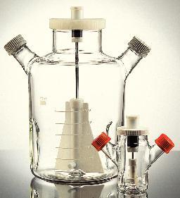 PYREX* Brand Spinner Flask^ Baffled to enhance agitation of the contents. Dynamic vortex impellers ensure high performance stirring. Wide, angled sidearms permit entry of 25 and 50ml pipets for feeding and harvesting of cells. Volume: 3L. Center Neck OD: 100mm. Sidearm Neck OD: 45mm.