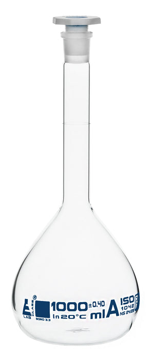 1000ml capacity volumetric flask made of high quality, heavy duty Borosilicate 3.3 glass. Single, white graduation mark. Includes an interchangeable, 24/29 polypropylene stopper. Class A, tolerance, ±0.40ml as per ISO . Calibrated to contain. Includes individual work certificate.Flask stands 12.2" tall, and has a bottom diameter of 120mm. Neck has a diameter of 27mm.Autoclavable, with superior chemical durability. Low temperature gradient- can withstand high temperatures & thermal shocks. Eisco Labs Borosilicate glass has the following heat tolerances: Strain Point -515°C | Annealing Point 565°C | Softening Point 820°C.Eisco Labs proudly manufactures its own products using state-of-the-art equipment, and following the highest standards of quality control.Each product is carefully designed by a team of laboratory professionals and experienced engineers with quality and durability in mind. They are manufactured with only the highest grade, raw materials and according to international quality standards to ensure that they can withstand use in even the toughest laboratory environments.