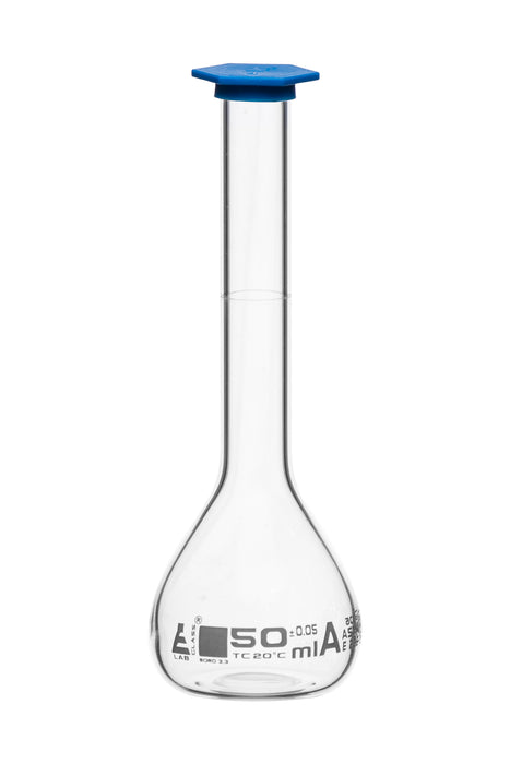 50ml capacity volumetric flask made of high quality, heavy duty Borosilicate 3.3 glass. Single, white graduation mark and a blue snap cap. Class A, tolerance, ±0.100ml. Calibrated to contain.Flask stands 5.75" tall, and has a bottom diameter of 1.75". Neck has a diameter of 13mm.Autoclavable, with superior chemical durability. Low temperature gradient- can withstand high temperatures & thermal shocks. Eisco Labs Borosilicate glass has the following heat tolerances: Strain Point -515°C | Annealing Point 565°C | Softening Point 820°C.Eisco Labs proudly manufactures its own products using state-of-the-art equipment, and following the highest standards of quality control.Each product is carefully designed by a team of laboratory professionals and experienced engineers with quality and durability in mind. They are manufactured with only the highest grade, raw materials and according to international quality standards to ensure that they can withstand use in even the toughest laboratory environments.