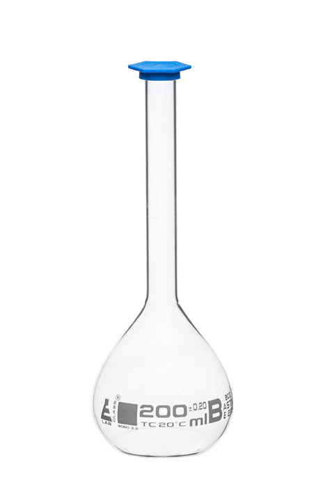 200ml capacity volumetric flask made of high quality, heavy duty Borosilicate 3.3 glass. Single, white graduation mark and a blue snap cap. Class B, tolerance, ±0.20ml. Calibrated to contain.Flask stands 8.25" tall, and has a bottom diameter of 3". Neck has an inner diameter of 14mm and an outer diameter of 18mm.Autoclavable, with superior chemical durability. Low temperature gradient- can withstand high temperatures & thermal shocks. Eisco Labs Borosilicate glass has the following heat tolerances: Strain Point -515°C | Annealing Point 565°C | Softening Point 820°C.Eisco Labs proudly manufactures its own products using state-of-the-art equipment, and following the highest standards of quality control.Each product is carefully designed by a team of laboratory professionals and experienced engineers with quality and durability in mind. They are manufactured with only the highest grade, raw materials and according to international quality standards to ensure that they can withstand use in even the toughest laboratory environments.
