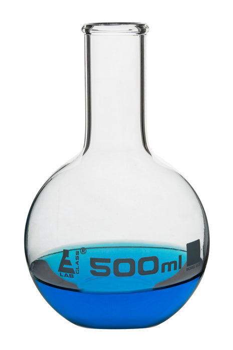 500ml Flat bottom Florence boiling flask made of heavy duty borosilicate glass. Flask has a flat bottom. Long neck, Stopper not included. The flask is ideal for dealing with liquids at different temperatures due to its thick-walled design. It is easy to use in any lab with its flat bottom, narrow neck, and beaded rim.Autoclavable, with superior chemical durability. Low temperature gradient- can withstand high temperatures & thermal shocks. Eisco Labs Borosilicate glass has the following heat tolerances: Strain Point -515°C | Annealing Point 565°C | Softening Point 820°C.Eisco Labs proudly manufactures its own products using state-of-the-art equipment, and following the highest standards of quality control.Each product is carefully designed by a team of laboratory professionals and experienced engineers with quality and durability in mind. They are manufactured with only the highest grade, raw materials and according to international quality standards to ensure that they can withstand use in even the toughest laboratory environments.
