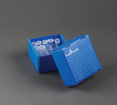 Freezer Box^ Flat pack, Freezer Box, Reusable, ecomomical and moisture resistanst placstic, corrugated polypropylene, Dividers included in box. 15mL, 36 place, Blue box
