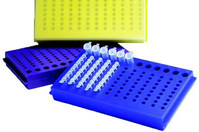 FlipStrip microtube rack with lid^ One side fits 0.2 ml 8-tube strips with 1.5 ml tubes. Other side fits 0.5 ml tubes. Blue color. Environmentally friendly, made from recycled plastic.