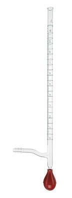 FLOWMETER, BUBBLE^ 10ml. Subdivisions: 0-10 in 0.05ml. Used for the control of carrier gases. Projection at top breaks bubbles. Supplied complete with rubber bulb. Hose connection has a O.D. of 9mm at the middle ring.