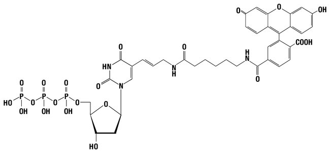 Fluorescein-12-dUTP (fluorescein-5(6)-carboxaminocaproyl-[5-{3-aminoallyl}-2'-deoxyuridine-5-triphosphate]) is supplied as 1 mM aqueous solution. Fluorescein-12-dUTP can be enzymatically incorporated into DNA with Reverse Transcriptases, Taq DNA Polymerase, phi29 DNA Polymerase, Klenow Fragment, exo-, Klenow Fragment and DNA Polymerase I.Fluorescein-12-dUTP can be enzymatically incorporated into DNA with Reverse Transcriptases, Taq DNA Polymerase, phi29 DNA Polymerase, Klenow Fragment, exo-, Klenow Fragment and DNA Polymerase I. Recommended for:Enzymatic non-radioactive labeling of DNA during cDNA synthesis, PCR, nick-translation, random primed labeling or primer extension.