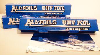 Ultra High Vacuum Aluminum Foil^ Designed for use in controlled environments, foil is virtually free from contamination and residual rolling oils. Supplied on a plastic core. Packaged in a plastic dispenser box and wrapped in film. Dimensions, WxL: 61cmx152.4m. Thickness: 0.0381mm.