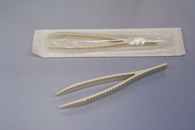 Sterile Disposable Forceps^ Sterile disposable forceps constructed of reinforced nylon. serrated blunt tip with 0.6 inch tip opening. white. 4.9 inches long. individually peel-packed. 100 per pack, 12 packs per case.