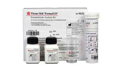 Tissue-Tek* FormaGO* Formaldehyde Analysis Kit^ Tissue-Tek* FormaGO* Formaldehyde Analysis Kit (100 strips with two reagent bottles), consistent results and leverages a long 2-year shelf life that improve inventory management, eliminates the upfront pH measurement