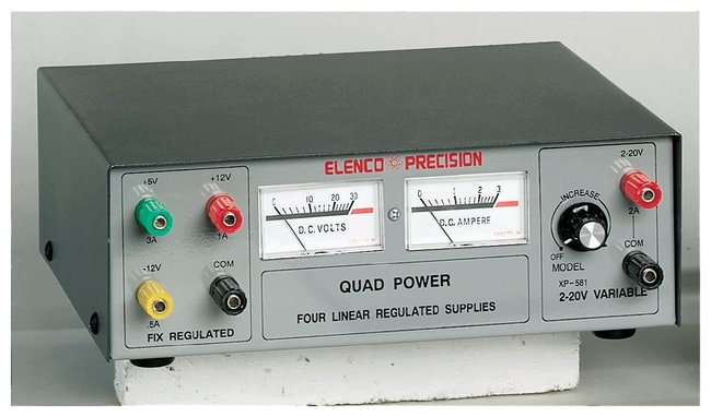 Applications include electronic circuits, ripple tank power sources, light bulb circuits and much more.Panel meters on the front face display the voltage and output current drawn from the adjustable output terminalsThree fixed and one variable outputAll outputs are fully regulated and short circuit-protected for maximum safetySpecifications:Variable output: 2-20V, 2A max.Fixed outputs: 5VDC, 3A max., ±12VDC, 1A max.Order InfoElectrical requirements: 120V 60Hz (2A fuse).