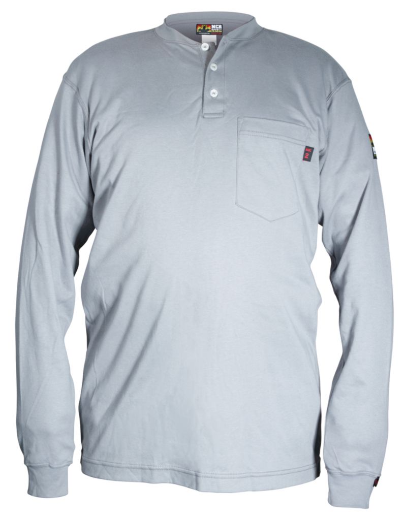 Shirt^ Henley Shirt Long Sleeve, Fr Gear, Max Comfort* Series, Color: Gray, Material: Flame Resistant, 100% Cotton, Front Closure: Button, Size: X2, Chest: 50-52, 3 Button Placket Front, Left Chest Pocket, Rib Knit Collar And Cuff, &Nbsp;Nfpa&Nbsp;2112&Nbsp;Ul&Nbsp;Certified, Henley Is Ul & Nfpa 2112 Certified