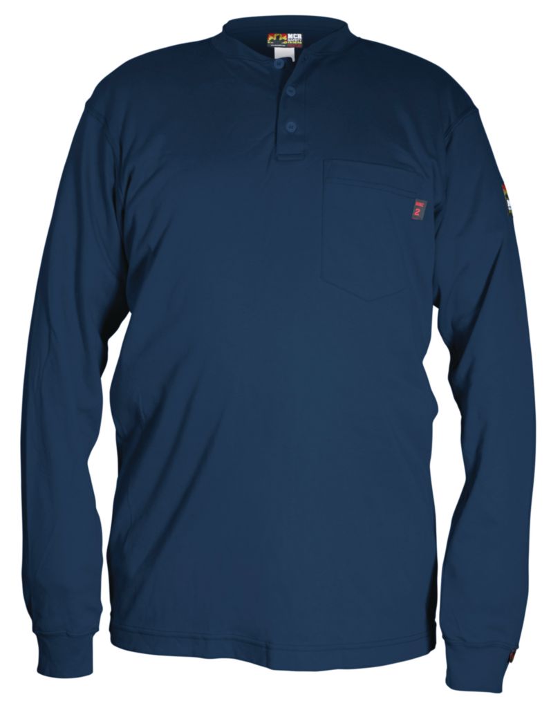 Shirt^ Henley Shirt Long Sleeve, Fr Gear, Max Comfort* Series, Color: Navy Blue, Material: Flame Resistant, 100% Cotton, Front Closure: Button, Size: Small, Chest: 34-36, 3 Button Placket Front, Left Chest Pocket, Rib Knit Collar And Cuff, &Nbsp;Nfpa&Nbsp;2112&Nbsp;Ul&Nbsp;Certified, Henley Is Ul & Nfpa 2112 Certified