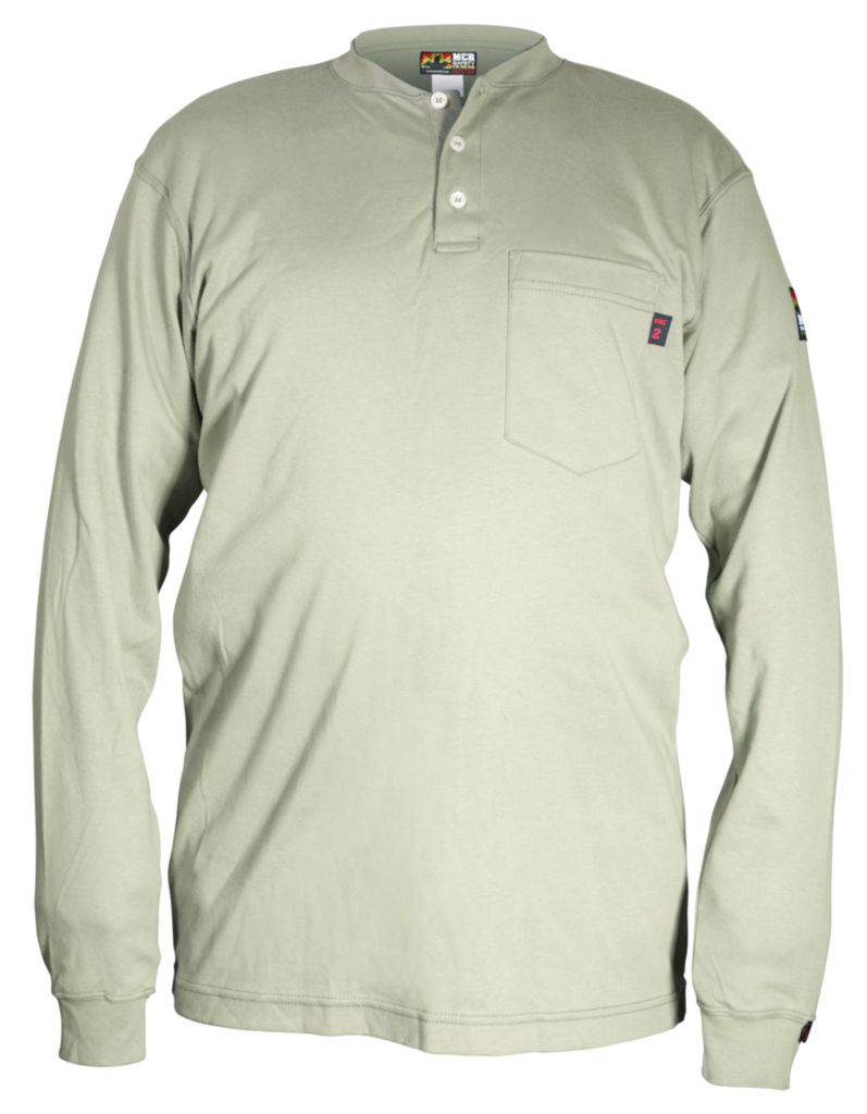 Shirt^ Henley Shirt Long Sleeve, Fr Gear, Max Comfort* Series, Color: Tan, Material: Flame Resistant, 100% Cotton, Front Closure: Button, Size: Xl, Chest: 46-48, 3 Button Placket Front, Left Chest Pocket, Rib Knit Collar And Cuff, &Nbsp;Nfpa&Nbsp;2112&Nbsp;Ul&Nbsp;Certified, Henley Is Ul & Nfpa 2112 Certified