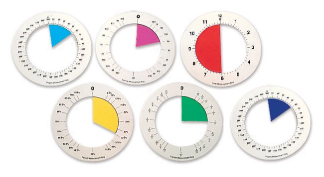 Fraction CirclesPlastic fraction circle pieces make up a 3.5 in. circleEach set includes: 1, 1/2, 1/3, 1/4, 1/5, 1/6, 1/8, 1/10 and 1/12 fraction piecesEach fraction gradation has its own distinct colorAlso available as overheadsFraction RingsTo be used with Fraction CirclesSet of six rings illustrating decimals, degrees, percentages, time, fractions and compass pointsCan also be used on an overhead projector