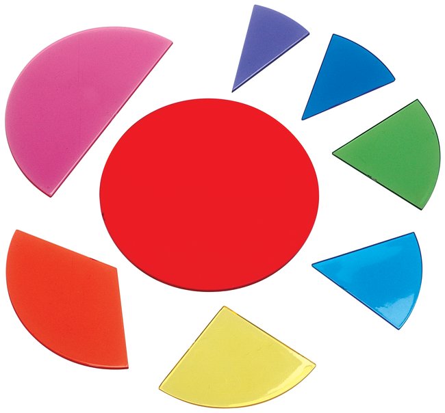 Fraction CirclesPlastic fraction circle pieces make up a 3.5 in. circleEach set includes: 1, 1/2, 1/3, 1/4, 1/5, 1/6, 1/8, 1/10 and 1/12 fraction piecesEach fraction gradation has its own distinct colorAlso available as overheadsFraction RingsTo be used with Fraction CirclesSet of six rings illustrating decimals, degrees, percentages, time, fractions and compass pointsCan also be used on an overhead projector