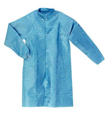 Here is the corrected text: Our laboratory frocks are made from a multilayered spunbonded-meltblown-spunbonded (SMS) fabric that offers high tensile strength while remaining soft, comfortable, and breathable. These static-dissipative garments act as a fluid and particulate barrier without sacrificing comfort or restricting movement. Garments feature a snap collar and snap front, raglan sleeves, and elastic cuffs. No pockets are included, and seams are serged. Our frocks are rigorously tested and manufactured in an ISO Certified facility under stringent process controls to ensure that each garment meets exacting quality standards and performs to specification. Lot controlled and validated through independent lab testing. They provide light chemical splash resistance. The material is low-linting and resistant to tears and punctures, making it ideally suited for use in high-class protection areas of medical, industrial, laboratory, electronic, and pharmaceutical environments. Key features: • Multilayer SMS material protection • Light fluid and particulate barrier • Excellent breathability • No pockets • Serged seams Available in various sizes, including S, M, L, XL, 3XL, and XXL, with colors blue and white. Weight: 50.45 g/m².