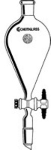 FUNNEL, SEPARATORY, SQUIBB, FLUOROPOLYMER RESIN STOPCOCK^ 125ml. Overall H: 265mm. Joint size: 14/20. Squibb style separatory funnel with a fluoropolymer resin stopcock. Supplied without stopper. For stoppers see CG-3000. Stopcock bore on all sizes is 2mm.