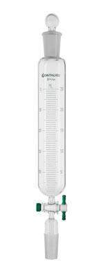 FUNNEL, SEPARATORY, GRADUATED, FLUOROPOLYMER RESIN STOPCOCK^ 125ml. Joint size: 24/40. Subdivisions: 1.0ml; Stopcock Size: 2. Cylindrical shaped separatory funnel having a lower standard taper inner joint and a top outer joint, both being the same size.