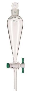 FUNNEL, SEPARATORY, SQUIBB, FLUOROPOLYMER RESIN STOPCOCK^ 30ml. Stopcock Size: 2; Stopper Size: 13. Squibb style separatory funnel with a fluoropolymer resin stopcock. Supplied complete with a flask length stopper of the listed size. For replacement stoppers see CG-3018.