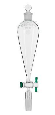 FUNNEL, SEPARATORY, SQUIBB, FLUOROPOLYMER RESIN STOPCOCK^ 500ml. Joint size: Lower: 24/40. Stopcock bore: 4mm. Stopper Size: 27. Similar to CG-1742, but with the plain lower stem replaced by a inner standard taper joint of the listed size having a sealed in drip tip.