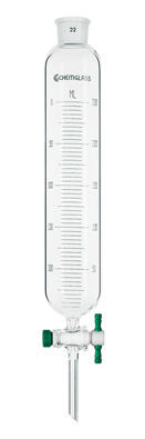 FUNNEL, SEPARATORY, GRADUATED, FLUOROPOLYMER RESIN STOPCOCK^ 500ml. Subdivisions: 5.0ml; Stopper Size: 27; Stopcock Size: 4. Similar to CG-1728, but graduated with a double scale of numbers, one up from the stopcock and one down from the capacity line. Supplied complete with listed size stopper.