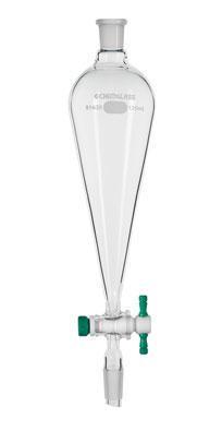 FUNNEL, SEPARATORY, SQUIBB, FLUOROPOLYMER RESIN STOPCOCK^ 60ml. Overall H: 165mm. Joint size: 14/20. Squibb style separatory funnel with a fluoropolymer resin stopcock. Supplied without stopper. For stoppers see CG-3000. Stopcock bore on all sizes is 2mm.